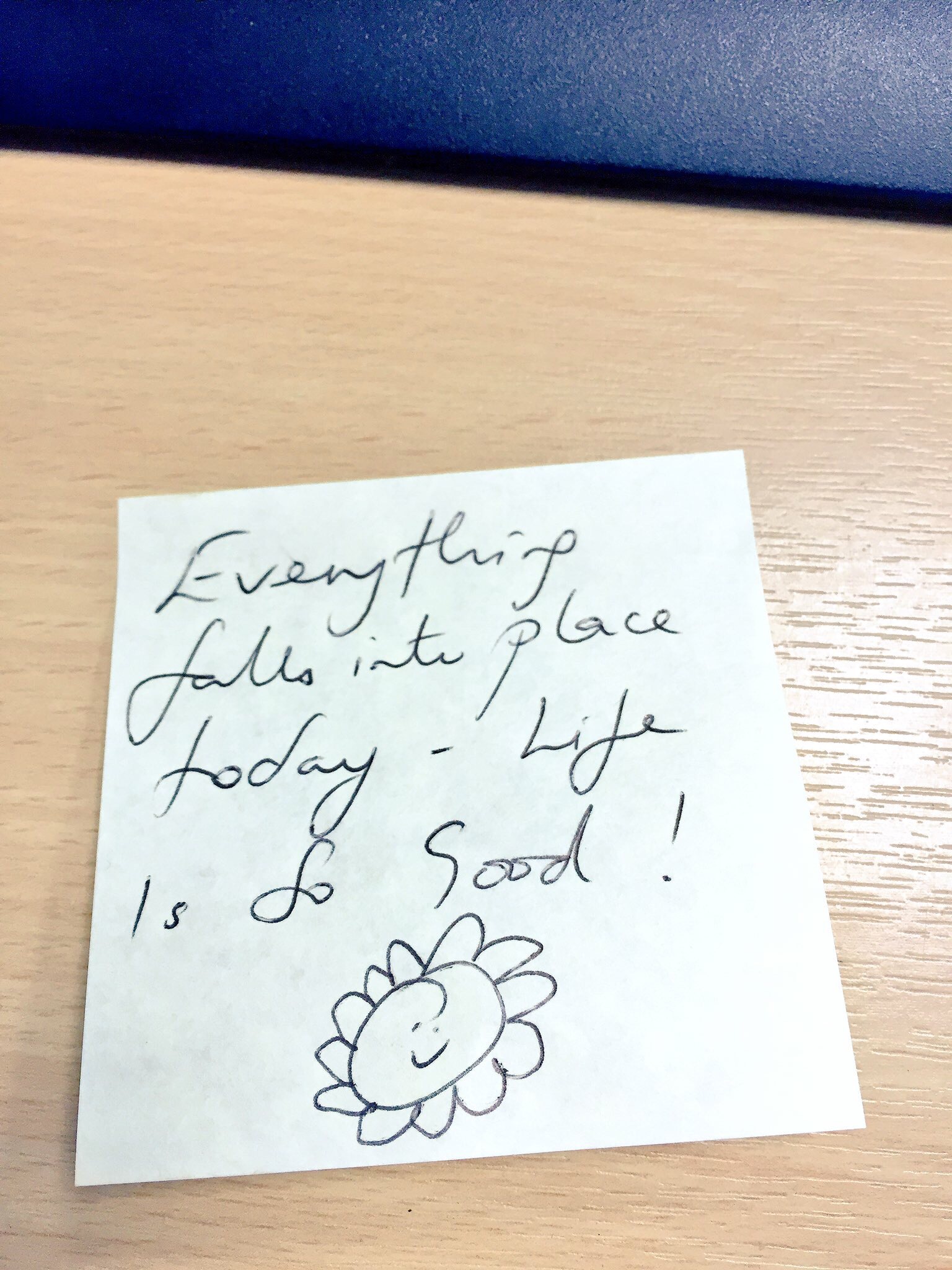I walked into work and saw this message stuck to my desk. It doesn’t take much to spread a bit of happiness.